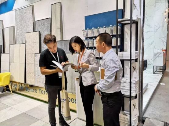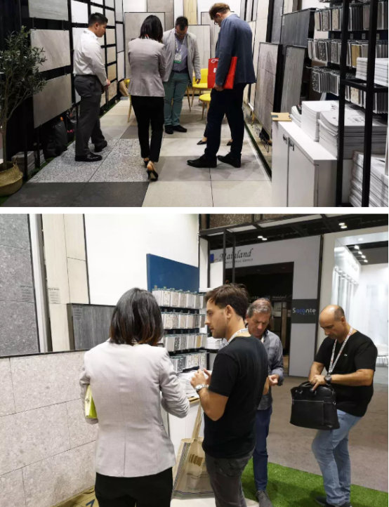 來自全球各地的客商,紛紛來到天欣科技×佛諾倫莎的展館參觀與洽談貿易合作,對于天欣科技在仿古磚的質感和花色上,以及對于代表目前國內高水平的2cm厚磚,客戶給予了充分的肯定,我們也再一次向世界展現了“CHINA”的力量。